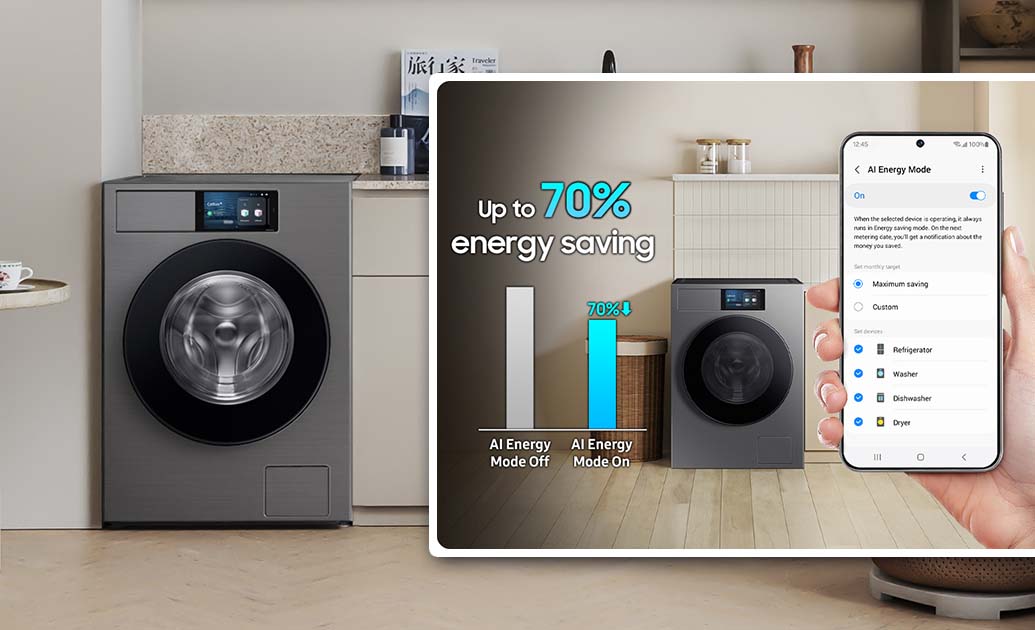 Резултатът е наистина впечатляваща енергийна ефективност A-55% и технологията AI Ecobubble™, която превръща перилния препарат в мехурчета, които проникват в тъканите по-бързо (дори при ниска температура), осигурявайки ефективно почистване и защита на дрехите, както и с до 70% по-нисък разход на енергия. Всичко се контролира изключително просто и лесно чрез 7-инчовия LCD дисплей, който прави управлението интуитивно и персонализирано, а връзката със SmartThings позволява проследяване разхода на ресурси в реално време. За тези, които държат на безупречната чистота, има и функция, която гарантира дълбоко почистване на тъканите от алергени и бактерии - Hygiene Steam.