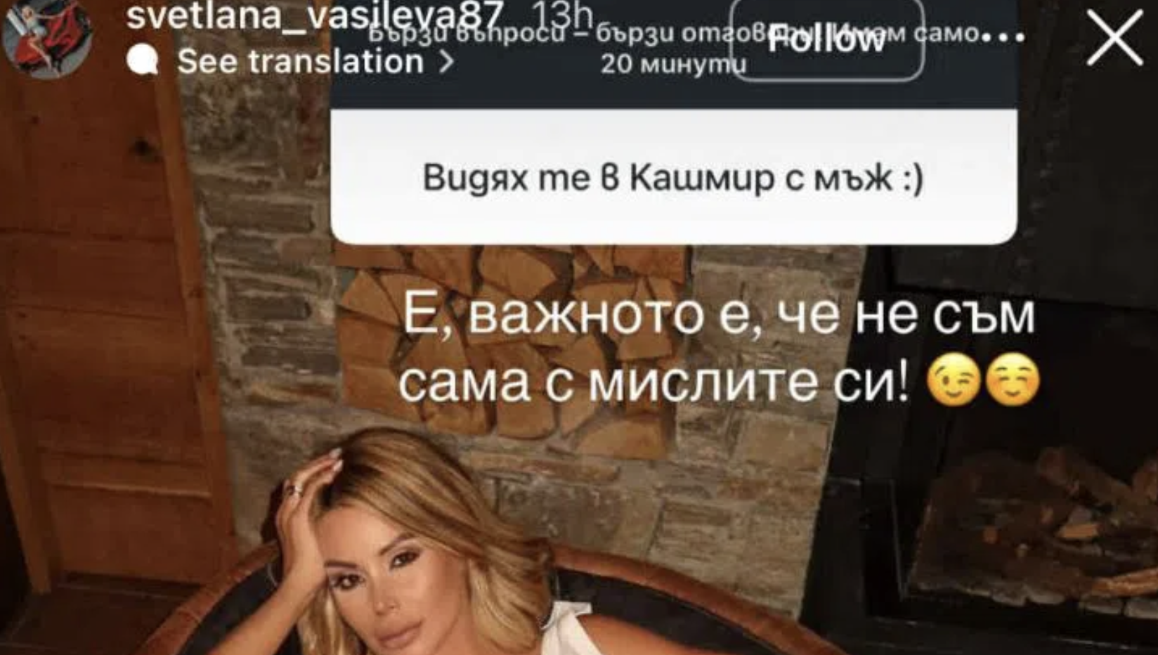 Светлана Василева отново разбуни духовете в социалните мрежи! Сексапилната блондинка, която съвсем наскоро финализира развода си с Християн Гущеров, явно не губи време и вече е обект на нови слухове.Василева даде възможност на феновете си да й задават въпроси в Инстаграм, а този, който заинтригува най-много почитателите й е: „Видях те в Кашмир с мъж :)“. А вместо да отрече или потвърди, Светлана хвърли загадъчен коментар: