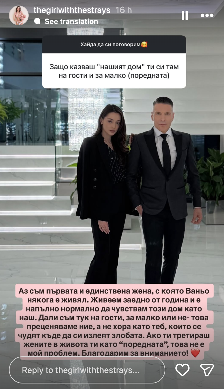 Думите на Валерия мигновено бяха разтълкувани като отровна стрела към бившата дългогодишна партньорка на Алексиев – модела Цвети Василева. Публична тайна е, че Цвети и Ваньо бяха заедно години наред и се считаха за едно от най-стабилните светски семейства. Ако твърдението на Валерия е вярно, това би означавало, че за цялото време на връзката им, Цвети така и не е споделяла един покрив с бизнесмена в пълния смисъл на думата – детайл, който звучи доста унизително за миналото им.