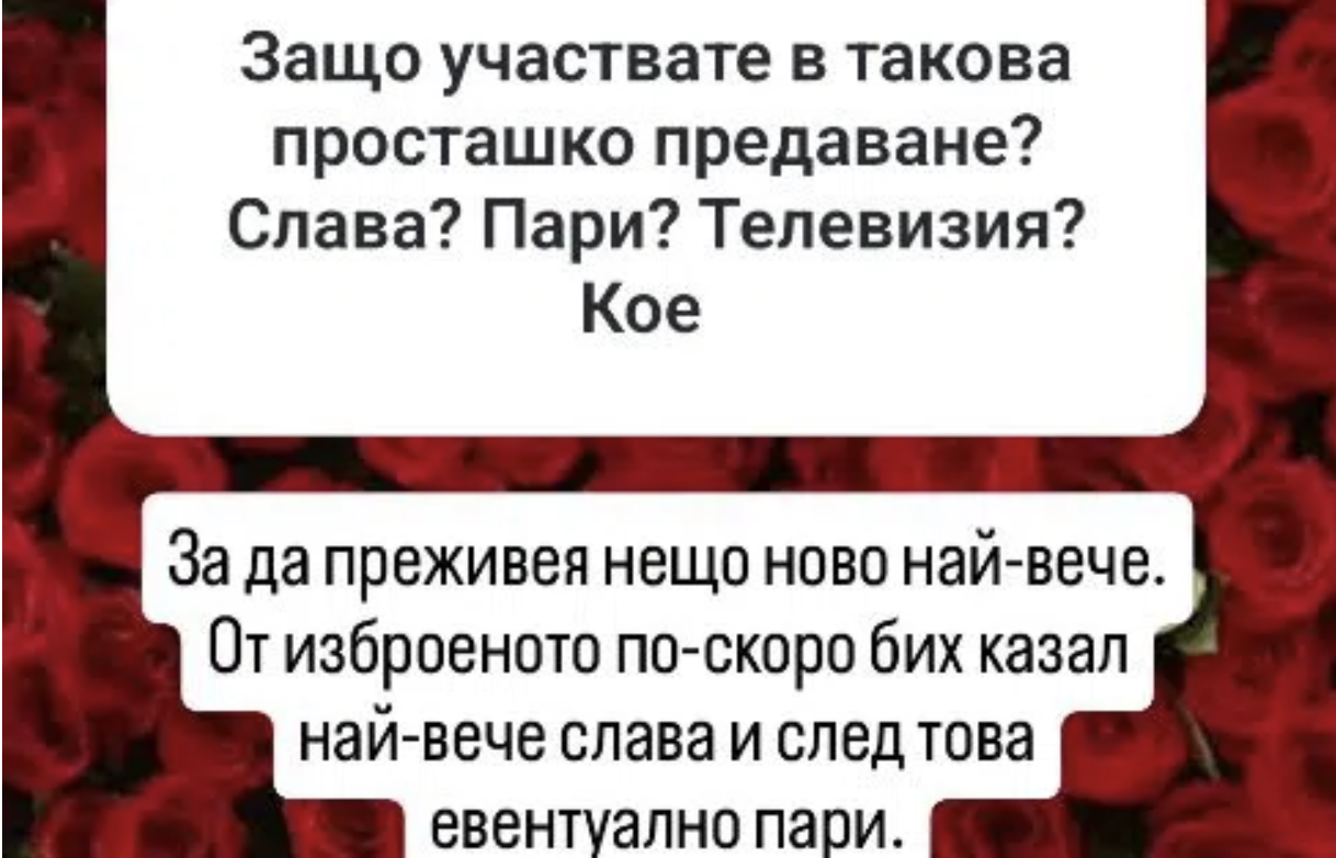 "Защо участвате в такова просташко предаване? Слава?Пари? Телевизия? Кое?", поинтересува се следовник на ергена, а той бе пределно ясен: "За да преживея нещо ново най-вече. От изброеното по-скоро бих казал най-вече слава и след това евентуално пари".