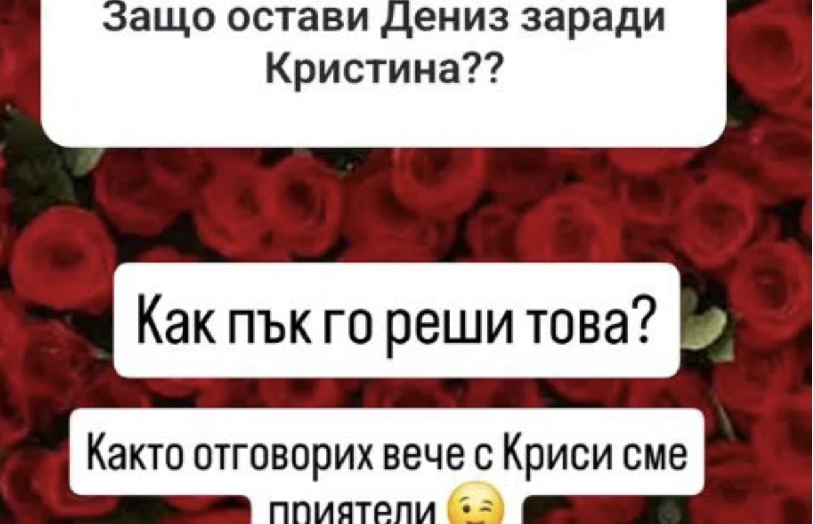 "С Криси сме приятели", отвръща на всички въпроси ергенът, без да дава повече яснота, както изискват правилата на формата, който все още се излъчва.