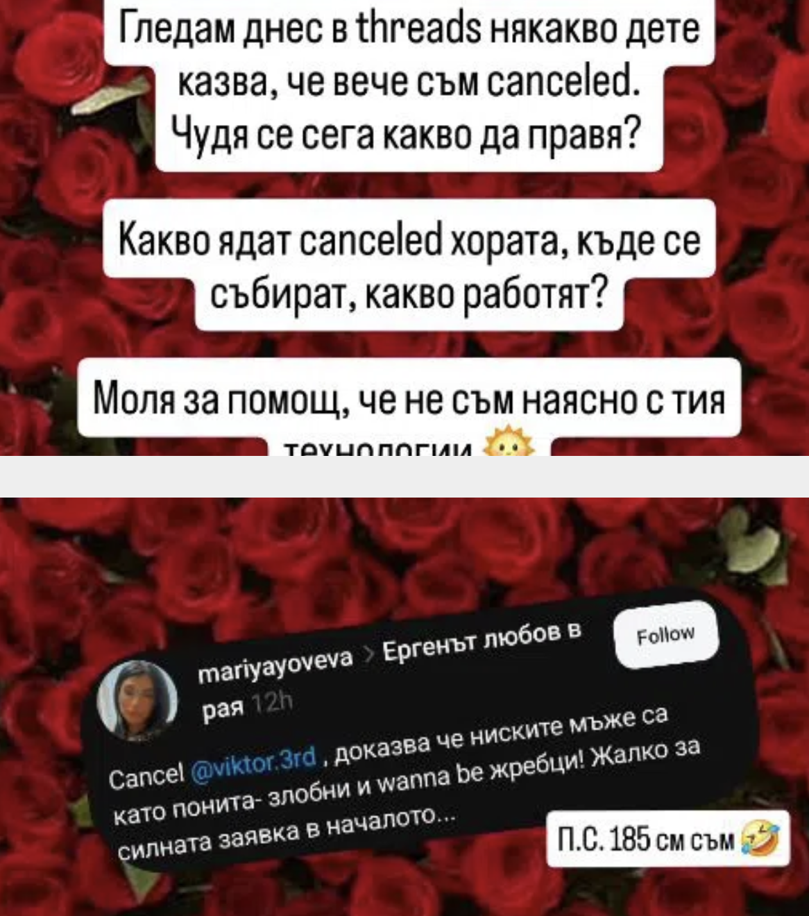 Той започна разговор с фенове, след като в публичното пространство заваляха призиви да бъде канселиран, подобно на Тото, след като директно обяви Орлин за гей. Виктор обаче не се впечатли особено от призивите и даже се пошегува на поста, който гласеше: "Виктор показа, че ниските мъже са като понита-злобни и само искат да бъдат жребци. Жалко за силната заявка в началото". 185 сантиметра съм висок, уточни само ергенът.